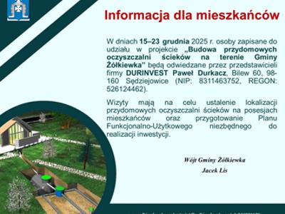 W dniach 15–23 grudnia 2025 r. osoby zapisane do udziału w projekcie „Budowa przydomowych oczyszczalni ścieków na terenie Gminy Żółkiewka” będą odwiedzane przez przedstawicieli firmy DURINVEST Paweł Durkacz,...