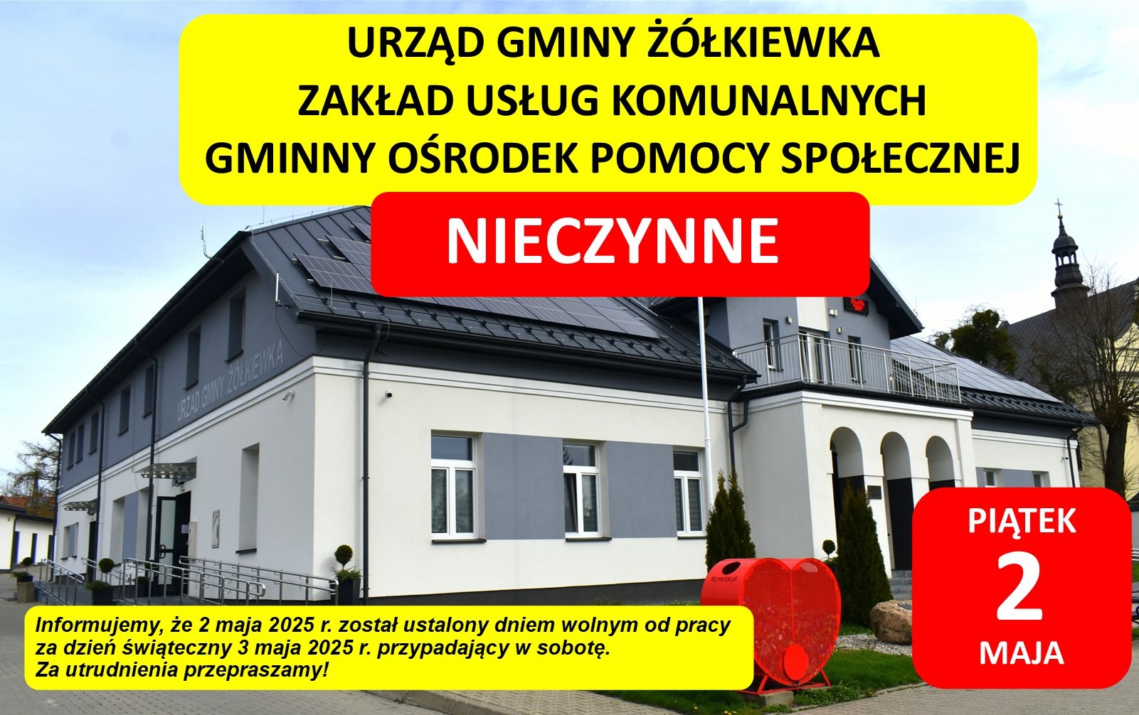 2 maja Urząd Gminy Żółkiewka będzie nieczynny. Drukuj Kopiuj link Facebook.com X.com Data publikacji: 15.04.2025 godz. 10:10 Wyświetlono: 138 Kategoria: Aktualności Tematyka: Informacja Wójta Gminy Żółkiewka Zobacz również Zobacz więcej 10.04.2025 Odbiór folii i innych odpadów rolniczych 12.04.2025 Kondolencje 14.04.2025 PRYSZCZYCA wspólne działanie, wspólne bezpieczeństwo