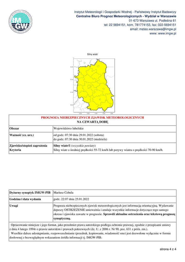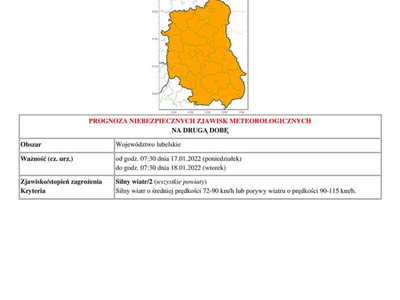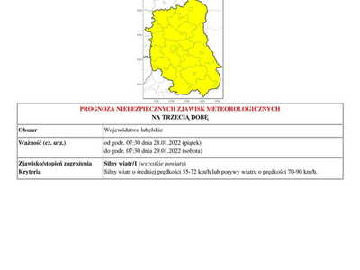 PROGNOZA NIEBEZPIECZNYCH ZJAWISK METEOROLOGICZNYCH Galeria zdjęć Drukuj Kopiuj link Facebook.com X.com Data publikacji: 27.01.2022 godz. 07:37 Wyświetlono: 244 Kategoria: Aktualności Zobacz również Zobacz więcej 05.01.2022 Rodzina 500+ i Rodzinny Kapitał Opiekuńczy 17.01.2022 PROGNOZA NIEBEZPIECZNYCH ZJAWISK METEOROLOGICZNYCH 17.01.2022 HARMONOGRAM STAŁYCH AKCJI TERENOWEGO POBORU KRWI NA...