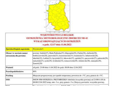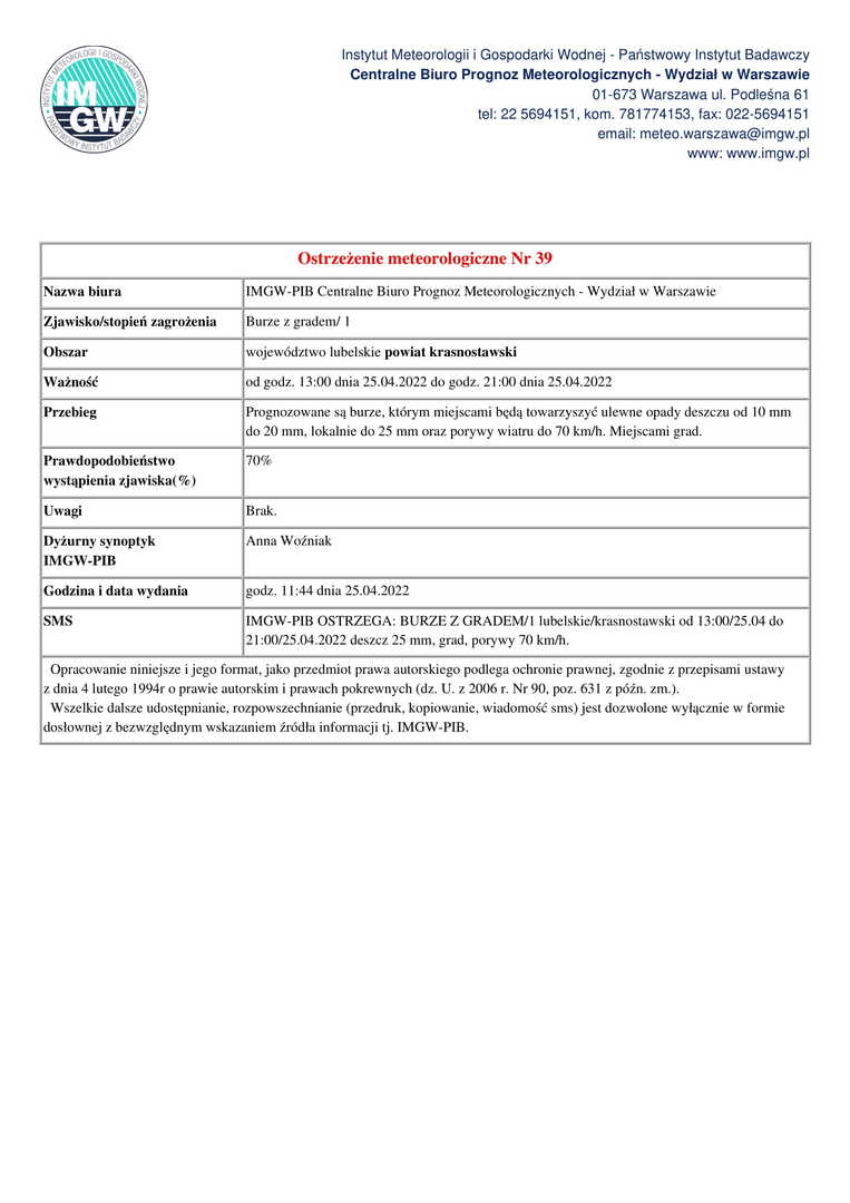 SMS IMGW-PIB OSTRZEGA: BURZE Z GRADEM/1 lubelskie/krasnostawski od 13:00/25.04 do