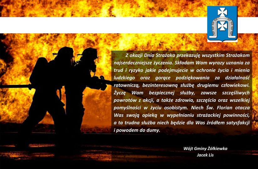 Z okazji Dnia Strażaka przekazuję wszystkim Strażakom najserdeczniejsze życzenia. Składam Wam wyrazy uznania za trud i ryzyko jakie podejmujecie w ochronie życia i mienia ludzkiego oraz gorące podziękowania za działalność ratowniczą, bezinteresowną służbę drugiemu człowiekowi. Życzę Wam bezpiecznej służby, zawsze szczęśliwych powrotów z akcji, a także zdrowia, szczęścia oraz wszelkiej pomyślności w życiu osobistym. Niech Św. Florian otacza Was swoją opieką w wypełnianiu strażackiej powinności, a ta trudna służba niech będzie dla Was źródłem satysfakcji i powodem do dumy.