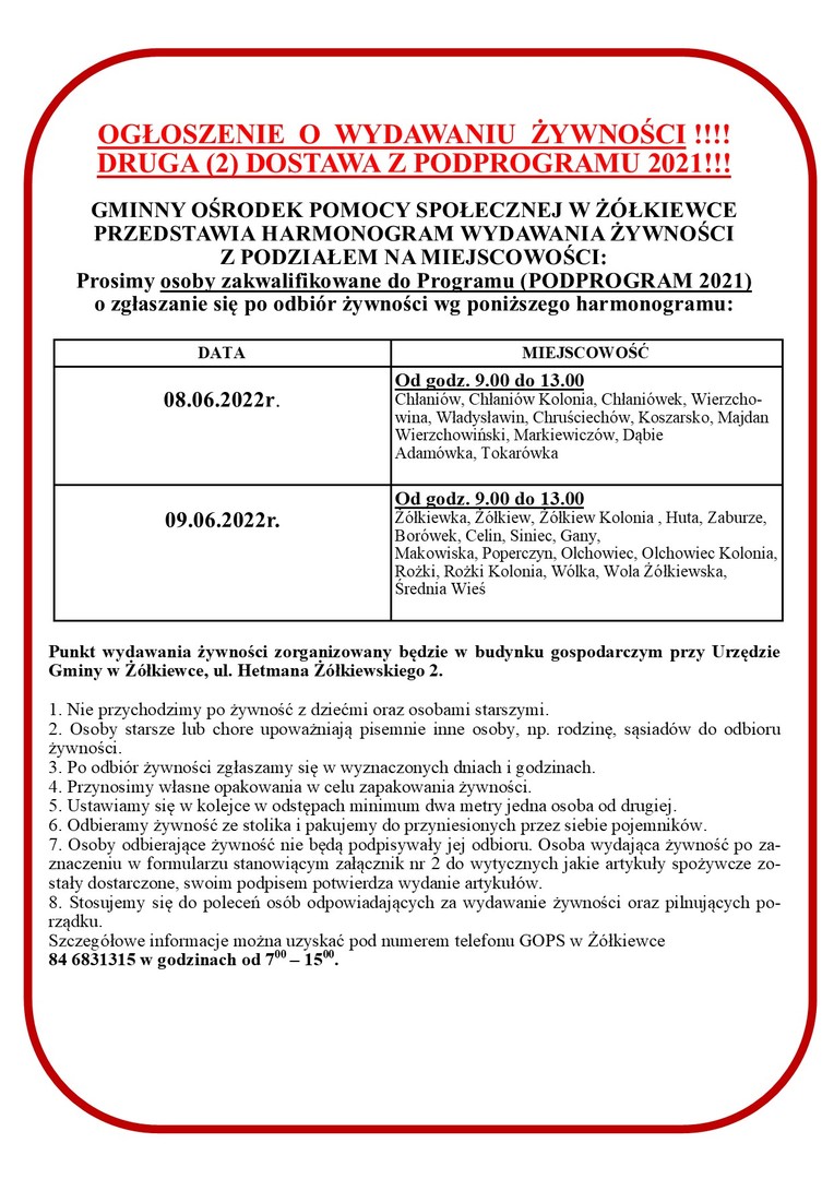 OGŁOSZENIE O WYDAWANIU ŻYWNOŚCI !!!! DRUGA (2) DOSTAWA Z PODPROGRAMU 2021!!!