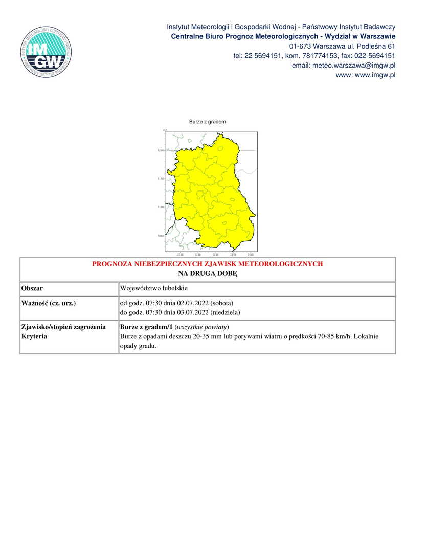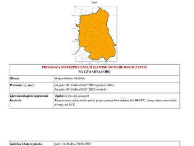 PROGNOZA NIEBEZPIECZNYCH ZJAWISK METEOROLOGICZNYCH Galeria zdjęć Załączniki upały i burze [299.12 kB] Drukuj Kopiuj link Facebook.com X.com Data publikacji: 01.07.2022 godz. 14:27 Wyświetlono: 205 Kategoria: Aktualności Zobacz również Zobacz więcej 24.06.2022 Szkolenie z prezentacją dobrych praktyk w zakresie... 24.06.2022 Nabór na stanowisko asystenta rodziny w Gminnym Ośrodku... 29.06.2022 Apel o oszczędzanie wody!