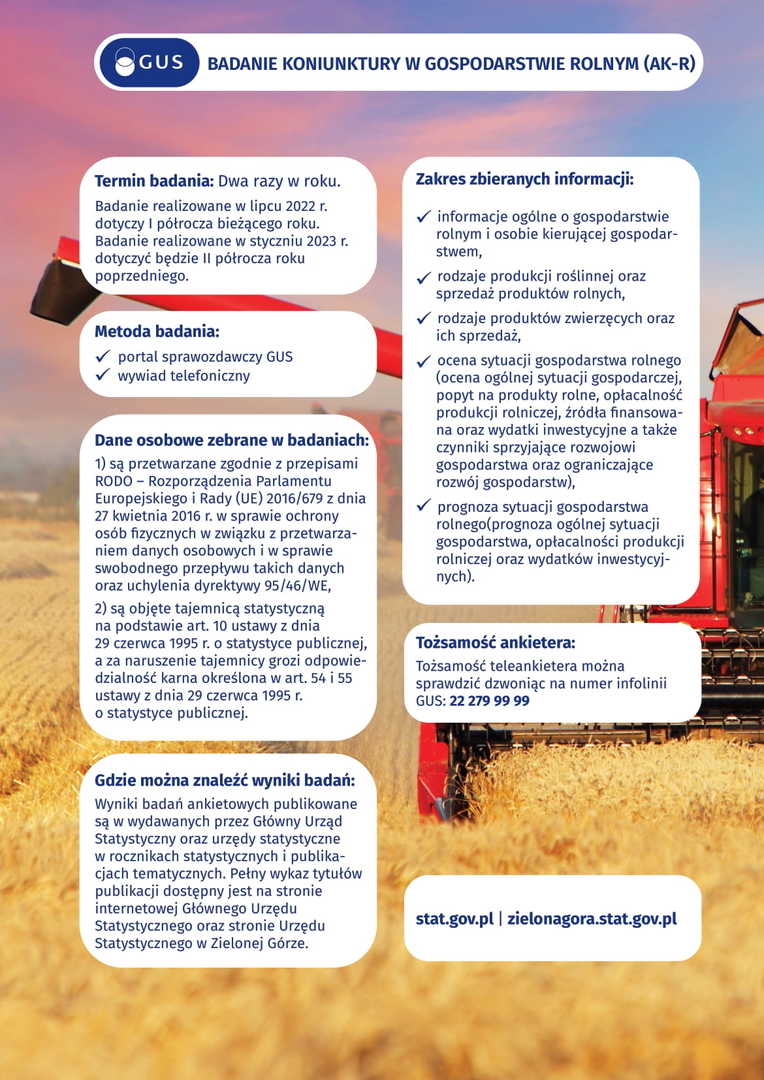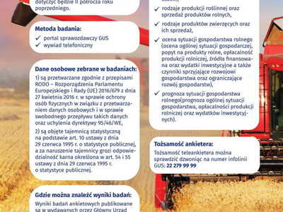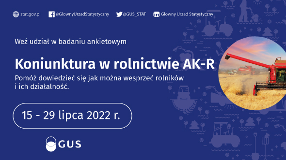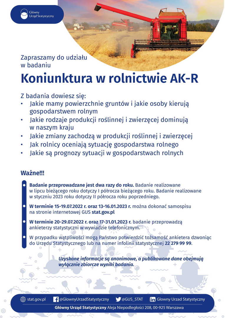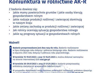 W dniach od 15 do 29 lipca br. na terenie całej Polski zostanie przeprowadzone Badanie Koniunktury w Gospodarstwach Rolnych (AK-R). Badanie prowadzone jest cyklicznie, dwa razy w roku, tj. w styczniu i lipcu, a jego wyniki prezentowane są odpowiednio we wrześniu danego roku i marcu roku następnego. Badanie dostarcza informacji o tym jak rolnicy oceniają przeszłą (poprzednie półrocze) i bieżącą koniunkturę w gospodarstwach rolnych oraz prognozują jej zmiany w następnym półroczu, w tym m.in. pokazuje opłacalność produkcji rolnej czy aktualny popyt na produkty rolne. Informacje te są niezbędne do podejmowania decyzji o kierunkach rozwoju rolnictwa na poziomie kraju, województwa, ale także każdej gminy. Uczestnictwo jak największej liczby osób w badaniu jest kluczowe dla jego efektywności.