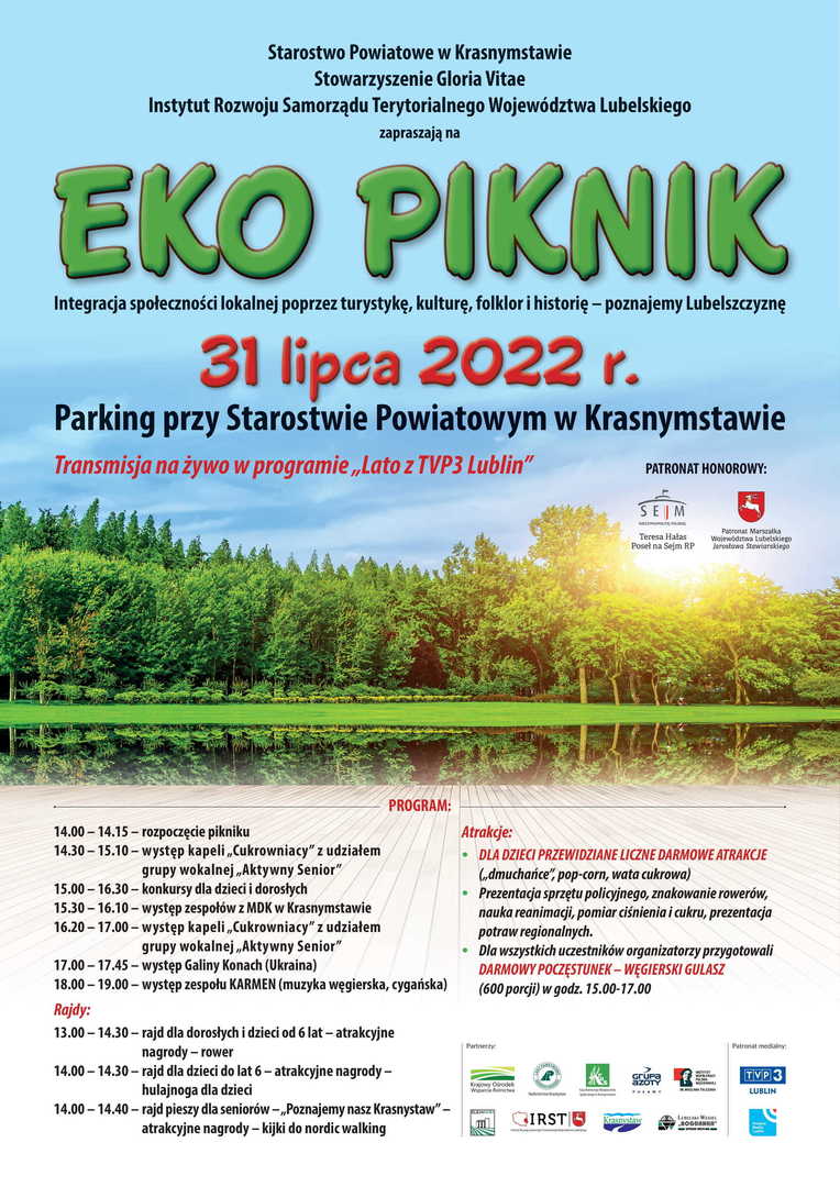 Starostwo Powiatowe w Krasnymstawie oraz partnerzy wydarzenia zapraszają na Eko Piknik, który odbędzie się 31 lipca 2022 r. na parkingu przy Starostwie Powiatowym w Krasnymstawie, ul. Sobieskiego 3. W programie przewidziane są gry, rajd rowerowy z atrakcyjnymi nagrodami, zabawy oraz animacje dla najmłodszych, atrakcje dla dzieci w postaci darmowych dmuchanych zjeżdżalni, popcornu i waty cukrowej. Odbędzie się prezentacja sprzętu policyjnego, znakowanie rowerów, pokaz ratownictwa przedmedycznego, prezentacja potraw regionalnych. Dla wszystkich uczestników organizatorzy przygotowali darmowy poczęstunek – węgierski gulasz.