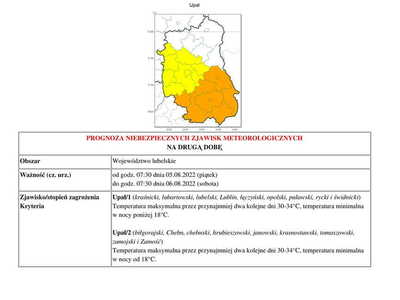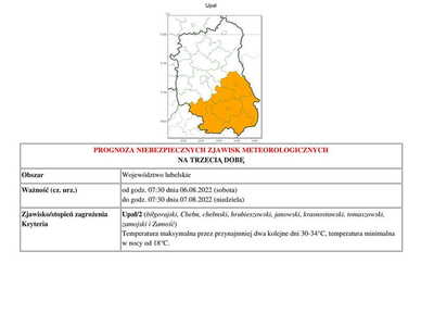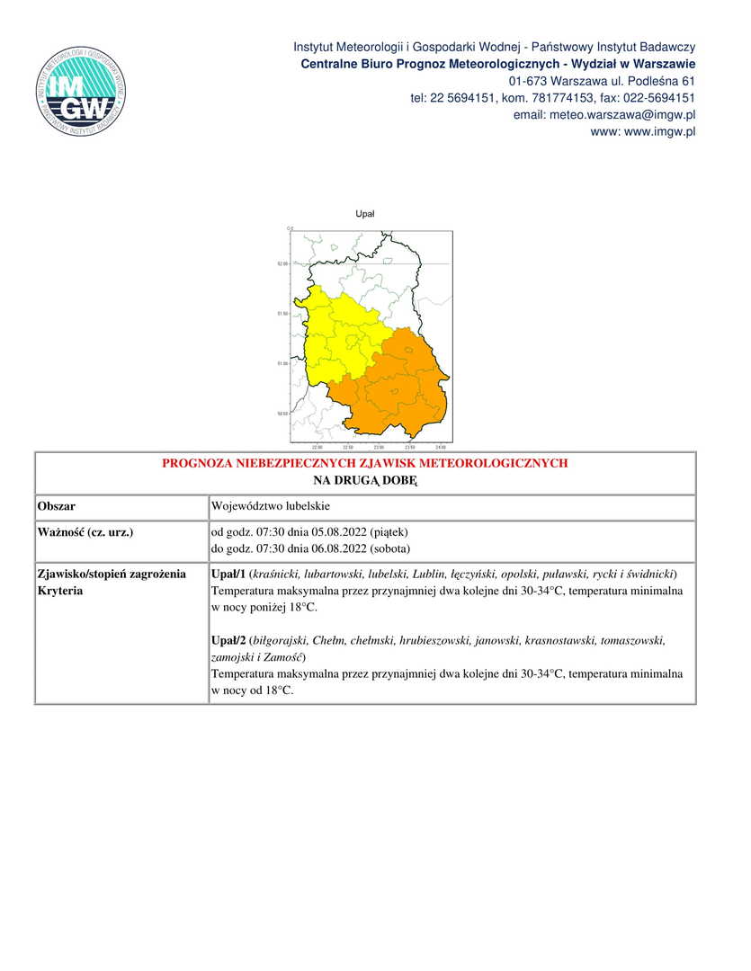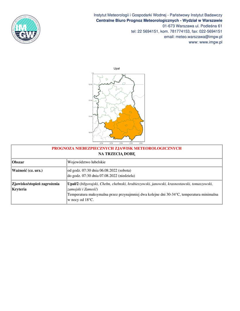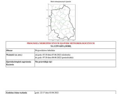 PROGNOZA NIEBEZPIECZNYCH ZJAWISK METEOROLOGICZNYCH Galeria zdjęć Drukuj Kopiuj link Facebook.com X.com Data publikacji: 04.08.2022 godz. 07:48 Wyświetlono: 244 Kategoria: Aktualności Zobacz również Zobacz więcej 19.07.2022 PROGNOZA NIEBEZPIECZNYCH ZJAWISK METEOROLOGICZNYCH 25.07.2022 EKO PIKNIK w Krasnymstawie - 31.07.2022 r. 29.07.2022 VIII Wojewódzkie Święto Ziół w Boniewie -15 sierpnia...
