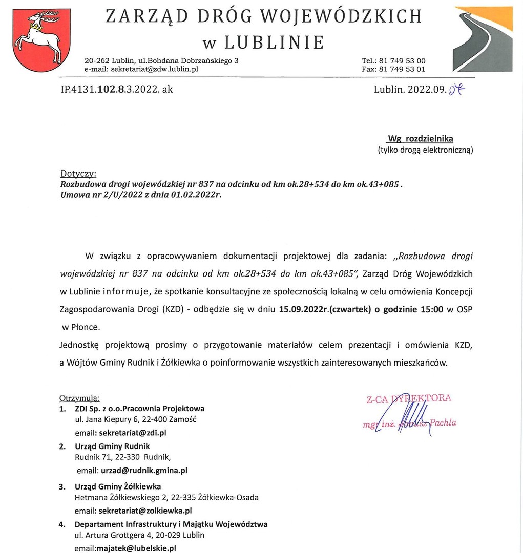 Zapraszamy na spotkanie konsultacyjne w celu omówienia koncepcji zagospodarowania drogi wojewódzkiej nr 837 w związku z opracowywaną dokumentacją projektową dla zadania "Rozbudowa drogi wojewódzkiej nr 837 na odcinku od km ok.28+534 do km ok.43+085". Spotkanie odbędzie się w czwartek 15.09.2022r. o godz. 15:00 w świetlicy wiejskiej w Płonce.