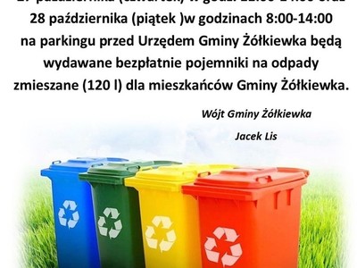 27 października (czwartek) w godz. 11:00-14:00 oraz 28 października (piątek )w godzinach 8:00-14:00 na parkingu przed Urzędem Gminy Żółkiewka będą wydawane bezpłatnie pojemniki na odpady zmieszane (120 l) dla mieszkańców Gminy Żółkiewka.
