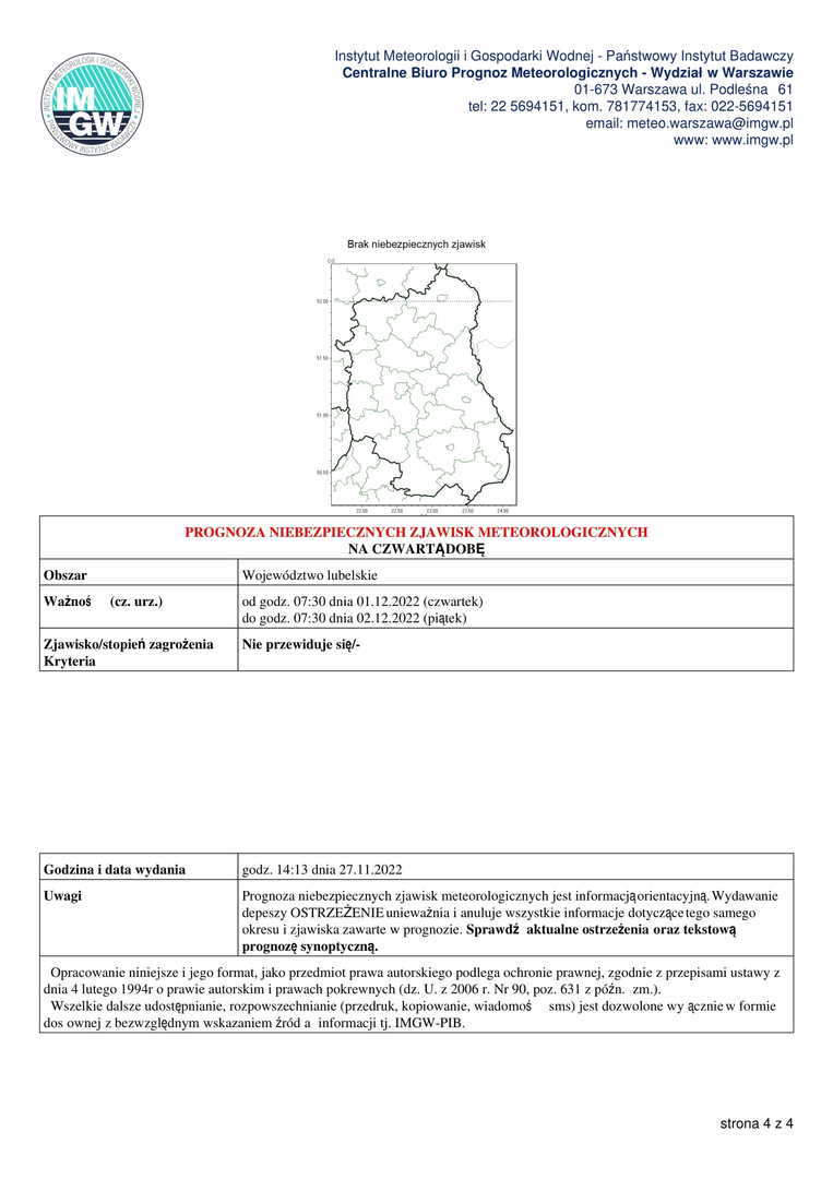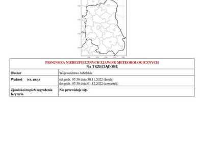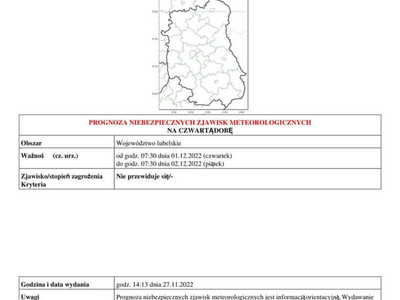 Prognoza niebezpiecznych zjawisk meteorologicznych - 28.11.2022 r. Galeria zdjęć Drukuj Kopiuj link Facebook.com X.com Data publikacji: 28.11.2022 godz. 09:32 Wyświetlono: 229 Kategoria: Aktualności Zobacz również Zobacz więcej 24.11.2022 INFORMACJA KIEROWNIKA GMINNEGO OŚRODKA POMOCY SPOŁECZNEJ... 24.11.2022 Wyjaśnienia Ministerstwa Klimatu i Środowiska dotyczące... 24.11.2022 Ogłoszenie o dystrybucji węgla