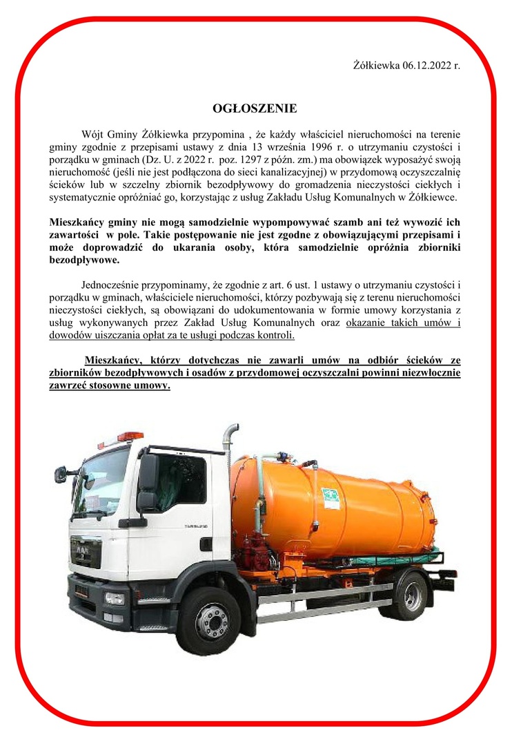 Wójt Gminy Żółkiewka przypomina , że każdy właściciel nieruchomości na terenie gminy zgodnie z przepisami ustawy z dnia 13 września 1996 r. o utrzymaniu czystości i porządku w gminach (Dz. U. z 2022 r. poz. 1297 z późn. zm.) ma obowiązek wyposażyć swoją nieruchomość (jeśli nie jest podłączona do sieci kanalizacyjnej) w przydomową oczyszczalnię ścieków lub w szczelny zbiornik bezodpływowy do gromadzenia nieczystości ciekłych i systematycznie opróżniać go, korzystając z usług Zakładu Usług Komunalnych w Żółkiewce.
