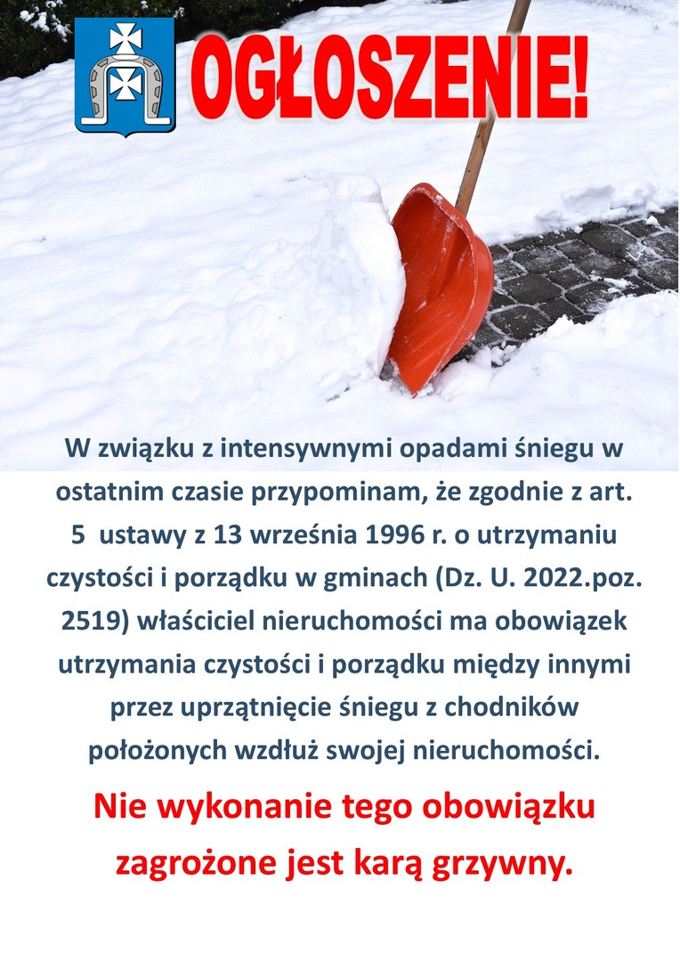 W związku z intensywnymi opadami śniegu w ostatnim czasie przypominam, że zgodnie z art. 5 ustawy z 13 września 1996 r. o utrzymaniu czystości i porządku w gminach ( Dz. U. 2022.poz. 2519) właściciel nieruchomości ma obowiązek utrzymania czystości i porządku między innymi przez uprzątnięcie śniegu z chodników położonych wzdłuż swojej nieruchomości.