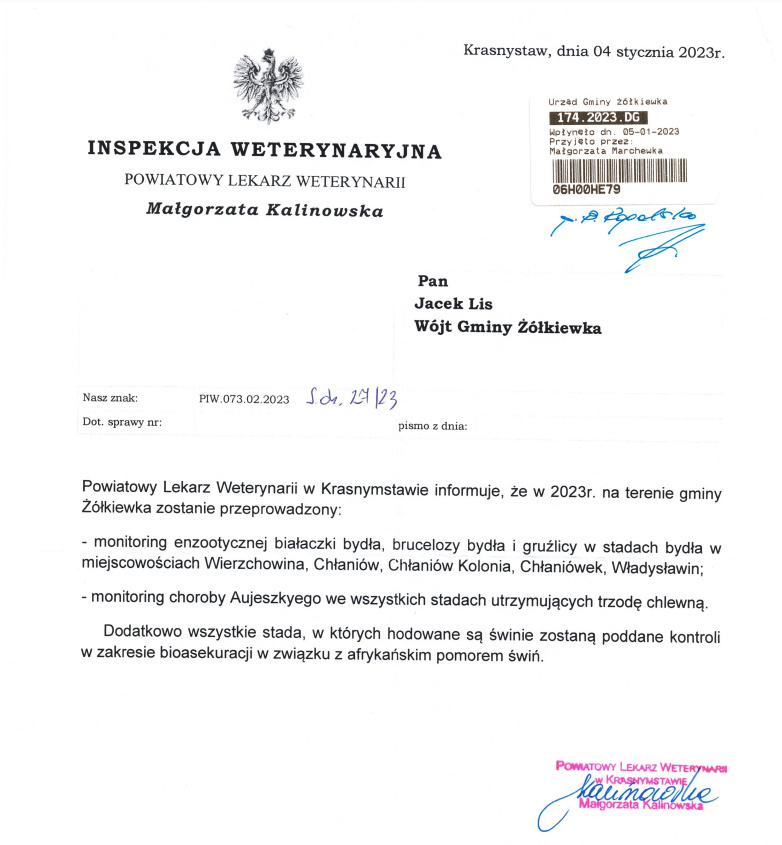 Informacja Powiatowego Lekarza Weterynarii w Krasnymstawie Galeria zdjęć Załączniki info powiatowego lek weterynari 4.01.2023 r. [984.28 kB] Drukuj Kopiuj link Facebook.com X.com Data publikacji: 09.01.2023 godz. 12:34 Wyświetlono: 439 Kategoria: Aktualności Zobacz również Zobacz więcej 05.01.2023 INFORMACJA DLA HODOWCÓW DROBIU 05.01.2023 ZARZĄDZENIE Nr 2/23 Wójta Gminy Żółkiewka z dnia 5... 09.01.2023 HARMONOGRAM ODBIORU ODPADOW NA 2023 ROK