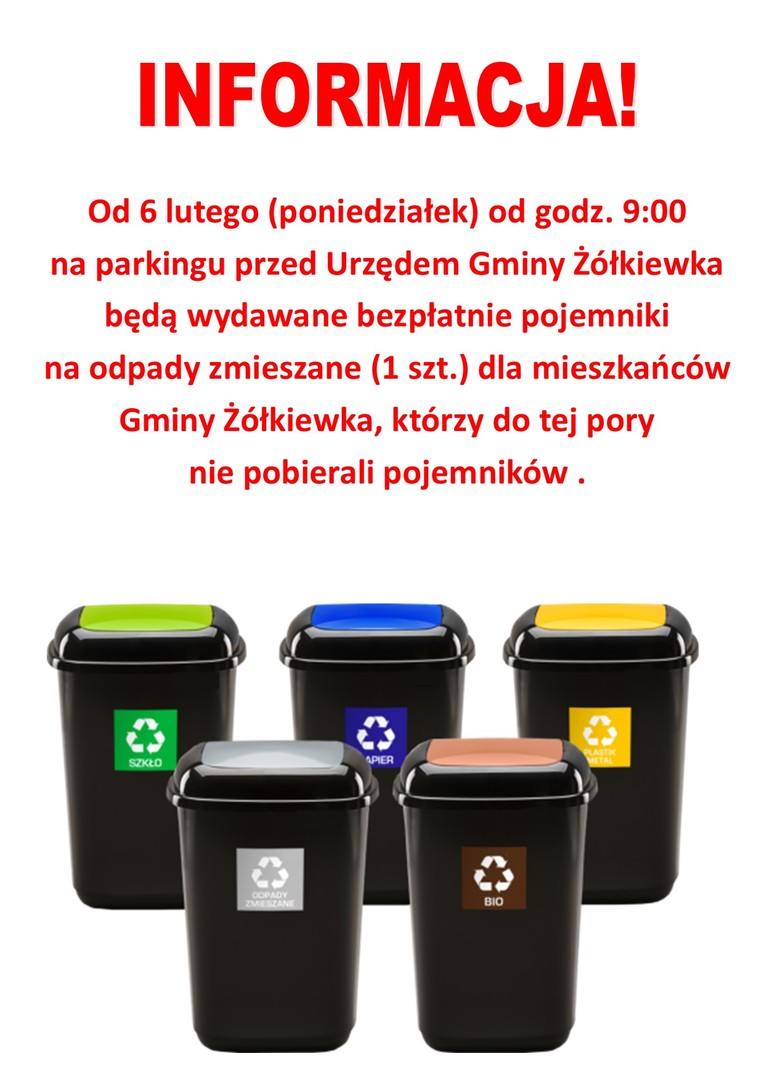 Od 6 lutego (poniedziałek) od godz. 9:00 na parkingu przed Urzędem Gminy Żółkiewka będą wydawane bezpłatnie pojemniki na odpady zmieszane (1 szt.) dla mieszkańców Gminy Żółkiewka, którzy do tej pory nie pobierali pojemników.