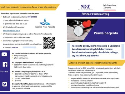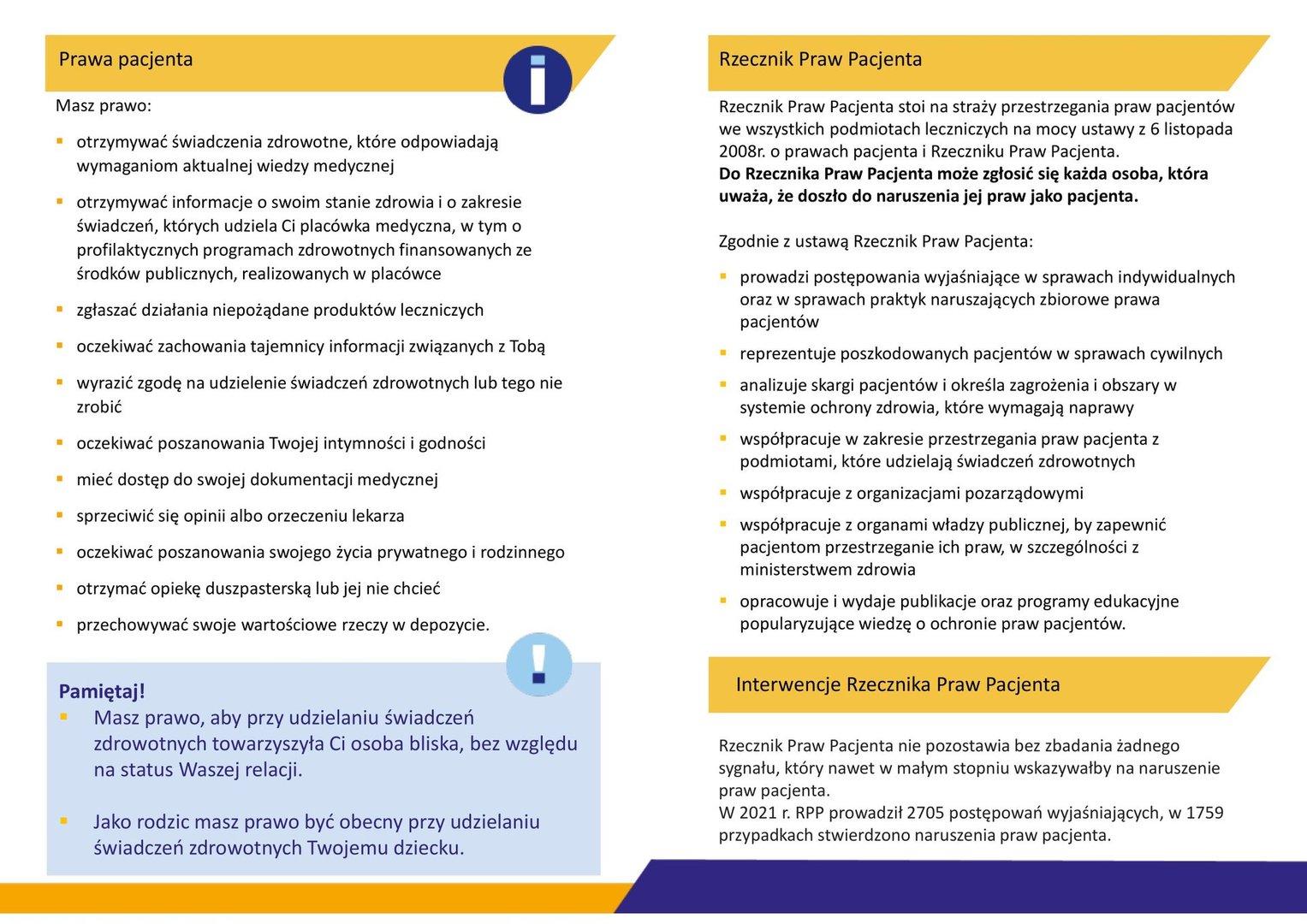 PRAWA PACJENTA Galeria zdjęć Załączniki Prawa Pacjenta - Ulotka ŚzP 08.02 (1) [541.12 kB] Drukuj Kopiuj link Facebook.com X.com Data publikacji: 10.02.2023 godz. 14:45 Wyświetlono: 459 Kategoria: Aktualności Zobacz również Zobacz więcej 31.01.2023 Zamrożenie cen prądu w 2023 roku - kto może skorzystać?... 01.02.2023 INFORMACJA DLA MIESZKAŃCÓW 01.02.2023 Prognoza niebezpiecznych zjawisk meteorologicznych...