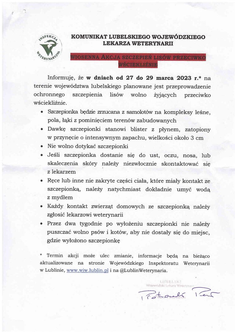 Komunikat Lubelskiego Wojewódzkiego Lekarza Weterynarii dotyczący wiosennego szczepienia lisów wolno żyjących przeciwko wściekliźnie. Załączniki komunikat LWLW szczepienie lisów [97.43 kB] Drukuj Kopiuj link Facebook.com X.com Data publikacji: 16.03.2023 godz. 07:36 Wyświetlono: 157 Kategoria: Aktualności Zobacz również Zobacz więcej 06.03.2023 VIII edycja ogólnopolskiego konkursu kulinarnego dla... 07.03.2023 Wojskowe Targi Służby i Pracy w dniach 17-18.03.2023... 08.03.2023 Dzień Kobiet!