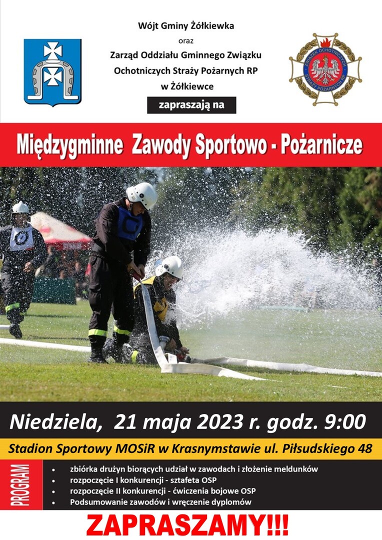 Wójt Gminy Żółkiewka, Zarząd Oddziału Gminnego ZOSP w Żółkiewce zapraszają na gminne zawody sportowo - pożarnicze jednostek OSP, które odbędą się dnia 21 maja 2023 r. o godz. 9:00 na stadionie MOSIR w Krasnymstawie.