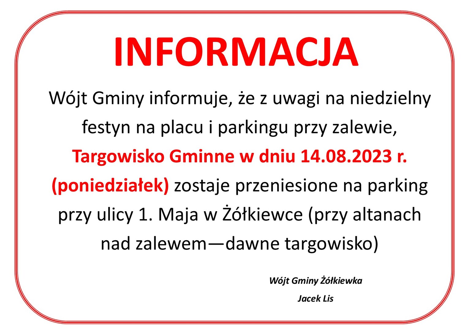 Wójt Gminy informuje, że z uwagi na niedzielny festyn na placu i parkingu przy zalewie, Targowisko Gminne w dniu 14.08.2023 r. (poniedziałek) zostaje przeniesione na parking przy ulicy 1. Maja w Żółkiewce (przy altanach nad zalewem—dawne targowisko)