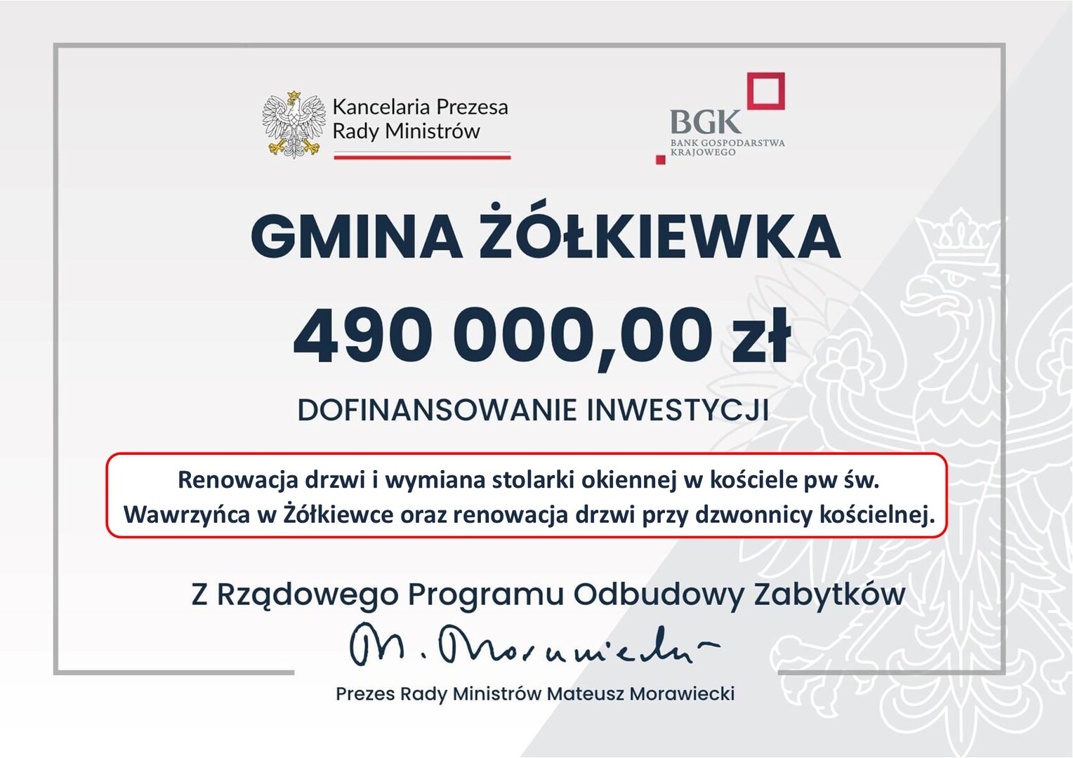 Szanowni Państwo! W dniu dzisiejszym miało miejsce ogłoszenie wyników naboru drugiej edycji Rządowego Programu Odbudowy Zabytków. Jest mi niezmiernie miło poinformować, że w ramach naboru udało się nam pozyskać 490 000, 00 zł na renowację drzwi, wymianę stolarki okiennej w kościele pw św. Wawrzyńca w Żółkiewce oraz renowacja drzwi przy dzwonnicy kościelnej!