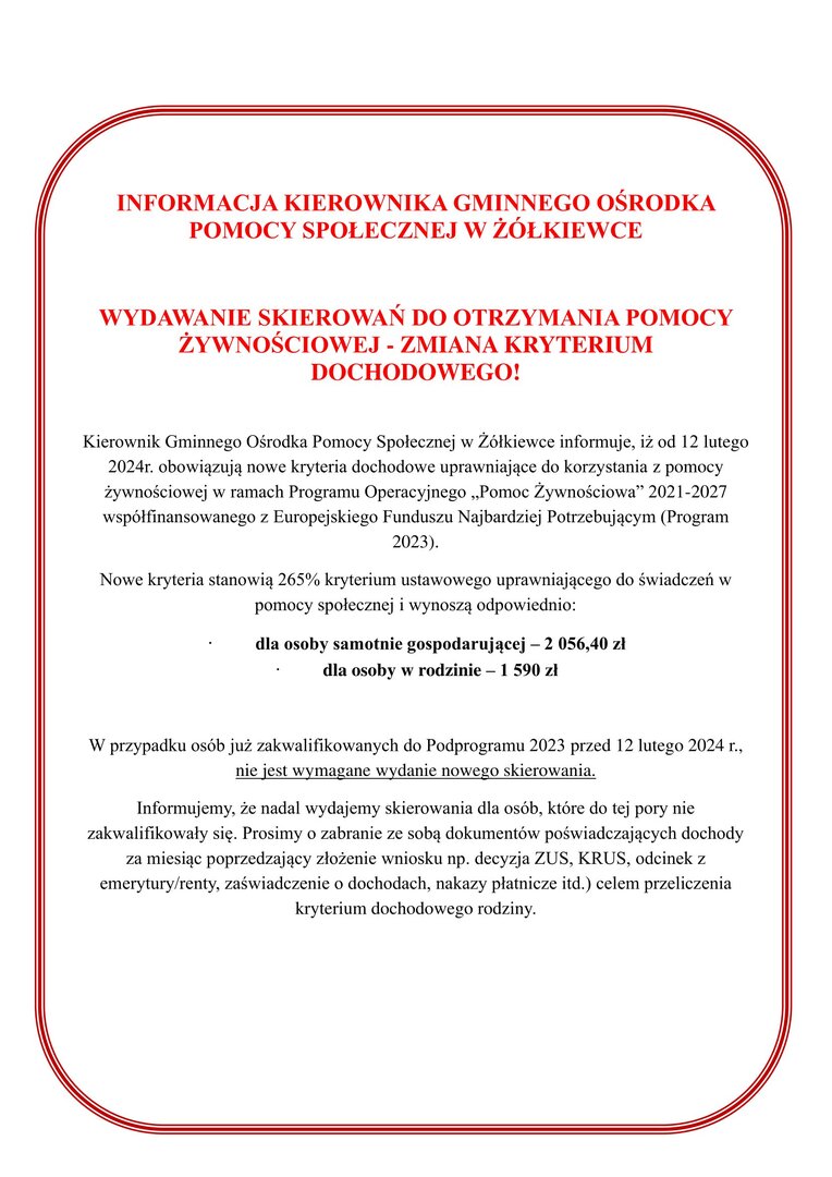 Kierownik Gminnego Ośrodka Pomocy Społecznej w Żółkiewce informuje, iż od 12 lutego 2024r. obowiązują nowe kryteria dochodowe uprawniające do korzystania z pomocy żywnościowej w ramach Programu Operacyjnego „Pomoc Żywnościowa” 2021-2027 współfinansowanego z Europejskiego Funduszu Najbardziej Potrzebującym (Program 2023).