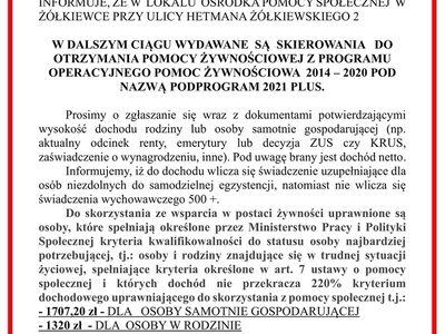 02.01.2023 Aktualności INFORMACJA DLA MIESZKAŃCÓW INFORMACJA GMINNY OŚRODEK POMOCY SPOŁECZNEJ W ŻÓŁKIEWCE INFORMUJE, ŻE W LOKALU OŚRODKA POMOCY SPOŁECZNEJ W ŻÓŁKIEWCE PRZY ULICY HETMANA ŻÓŁKIEWSKIEGO 2 W DALSZYM CIĄGU WYDAWANE SĄ ...