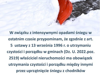 12.12.2022 Aktualności Ogłoszenie! W związku z intensywnymi opadami śniegu w ostatnim czasie przypominam, że zgodnie z art. 5 ustawy z 13 września 1996 r. o utrzymaniu czystości i porządku w gminach ( Dz. U. 2022.poz. 2519) właściciel...