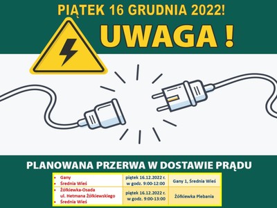 15.12.2022 Aktualności PLANOWANA PRZERWA W DOSTAWIE PRĄDU PLANOWANA PRZERWA W DOSTAWIE PRĄDU - piatek 16.12.2022 r. Gany Średnia Wieś piątek 16.12.2022 r. w godz. 9:00-12:00 Gany 1, Średnia Wieś Żółkiewka-Osada ul. Hetmana...